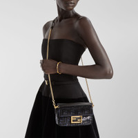 Small-size iconic Baguette® bag, embroidered all-over with blue and black sequins that depict the iconic FF motif. Decorated with an FF clasp. Featuring a front flap, magnetic clasp, one internal compartment lined with tone-on-tone satin and a blue calfskin card holder pocket and gold-finish metalware. The bag can be carried by hand or worn either on the shoulder or cross-body thanks to the handle and chain shoulder strap, both detachable. Holds a 6.7-inch smartphone, Mini Trifold card holder or wallet, keys and lipstick. Made in Italy Composition: 100% polyester, embroidery: 100% glass, 100% calfskin, inside: 100% polyester Product Code: 8BS017AVTAF0E2A
