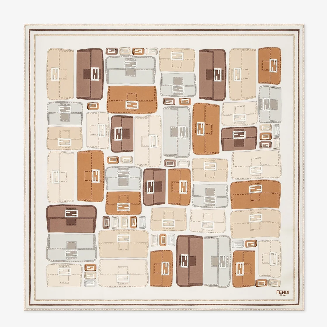 Square foulard made of organic silk twill. Customized with an eye-catching graphic design that depicts the iconic Fendi Baguette bag in different sizes in beige and brown. Finished with Selleria-inspired details and frame. Hand-rolled hems. Made in Italy Composition: 100% silk Product Code: FXT091AUMEF0VG2