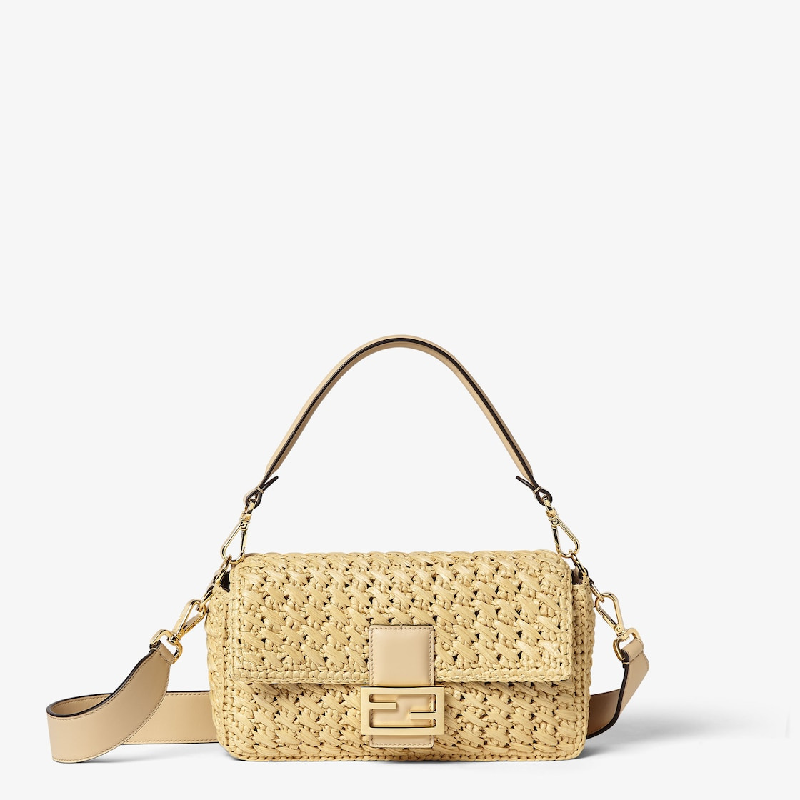 Iconic medium Baguette bag, created in 1997 which went on to become the leading It bag. Versatile and with timeless appeal, it features the iconic underarm design inspired by the French Baguette bread from which it takes its name. Made of viscose fibre woven entirely by hand, alternating different crochet stitches to create a refined droplet texture. Decorated with an FF clasp. Featuring a front flap, magnetic clasp, one internal compartment lined with the iconic, brown FF motif jacquard fabric with a zip pocket and gold-finish metalware. The bag can be carried by hand or worn either on the shoulder or cross-body thanks to the beige calfskin handle and shoulder strap, both detachable. Made in Italy Composition: 100% viscose, 100% calf leather, inside: 65% polyester, 35% cotton Product Code: 8BR600AV26F1PIY