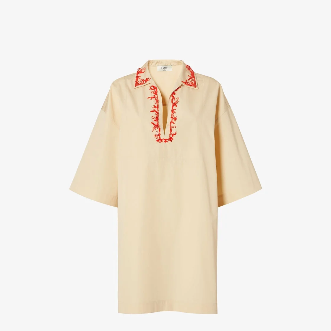 Short tunic dress featuring wide, low-cut sleeves and deep side slits. Made of beige compact cotton poplin. Embellished with coral embroidery with red beads and FF details on the polo-style open collar. Made in Italy Composition: 100% cotton Size worn: 38 IT. The model is 182 cm tall Product Code: FDD383AUJQF1SAZ