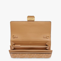 Baguette continental wallet with detachable, thin chain shoulder strap. The interior is laid out like a wallet with two gusseted compartments, a zip pocket, two flat pockets and ten card slots. Made of beige nappa leather. Finished with embossed FF motif. Gold-finish metalware. Made in Italy Composition: 100% Lambskin Measurements: - Height: 9 cm - Depth: 1 cm - Length: 19 cm Product Code: 8M0365AAJDF15KR