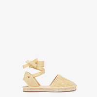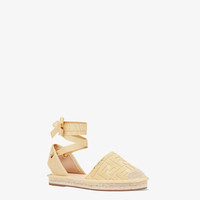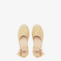 Fendi Roma espadrilles with laces to tie at the ankle. Rope and rubber sole. Made of beige raffia. The toe is customized with a matching embroidered FF motif. Fendi label on the back of the heel and grosgrain ribbon trim. Made in Spain PRODUCT INFORMATION - Product Code:: 8P7073ABN3F1A58 - Heel height:: 0.8 inches - Composition:: 57% Polyamide, 43% Cotton, ribbon: 56% Cotton, 44% Viscose, inside: 100% Goat leather