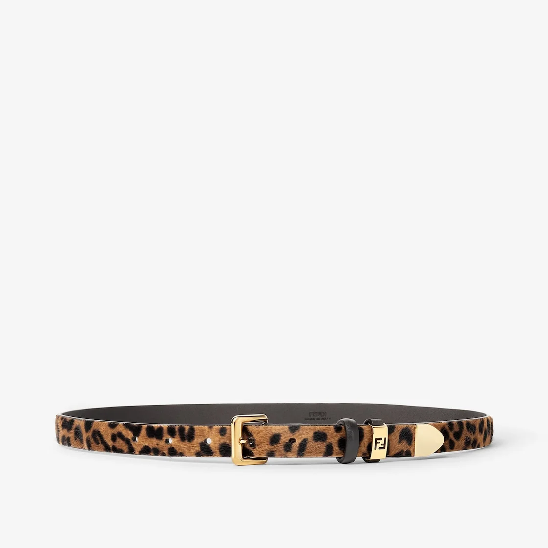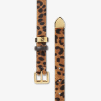 Slim belt with double loop and square buckle. Made of cavallino calfskin, with brown Fendi Leo pattern. Dark brown leather lining and belt loops. Decorated with a metal FF logo tag on one of the loops. Gold-colored metal tip. Gold-finish metalware. Made in Italy Composition: 100% calf hair, 100% calf leather Product Code: 8C0740AYDYF0A6E