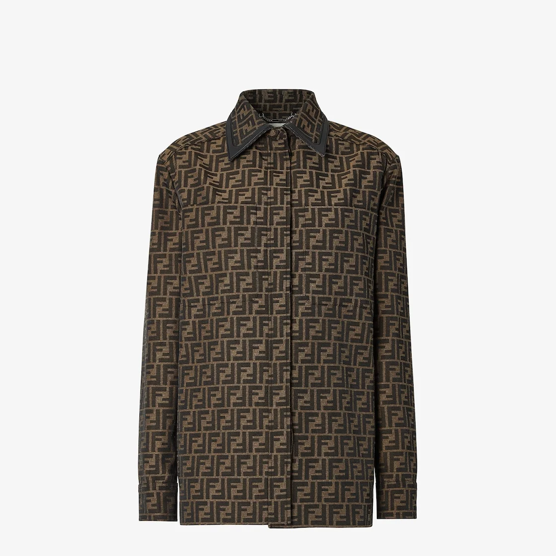 Straight-cut single-breasted jacket with shirt collar and cuffs. Two patch pockets on the chest. Concealed fastening with matching buttons. Unlined. Made of jacquard canvas with the iconic FF motif in brown. Collar trimmed with black leather. Made in Italy Composition: external fabric: 65% polyester, 35% cotton, 100% lambskin parts, lining: 100% cupro, 8 buttons: mother-of-pearl Size worn: 38 IT. The model is 177 cm tall Product Code: FJ7564A5W3F118W