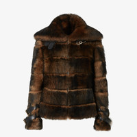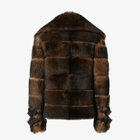 Aviator jacket with wide collar fastened with leather buckles and metal buckles. Zipper closure. Made of brown ‘dorsato’ shearling, inspired by the iconic Color Pequin motif from 1967: the horizontal bands create a trompe-l’oeil effect that mimics the voluminous texture of fox fur. Finished with black leather straps on the wrists. Made in Italy Composition: 100% lamb (ram) fur Product Code: FM5426AYLHF0QD9