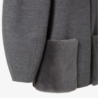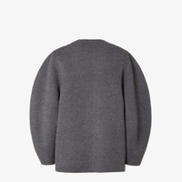 Single-breasted short jacket. Cocoon-style garment with wide long sleeves and crew neckline. Concealed front closure. Made of wool double fabric in a gray melange color. Lining customized with the tone-on-tone FF motif. Finished with gray shearling patch pockets. Made in Italy Composition: 99% fleece wool, 1% silk, 6 buttons: mother-of-pearl, pockets: 100% ram fur Size worn: 38 IT. The model is 178 cm tall Product Code: FJ7647A5HDF1M2T