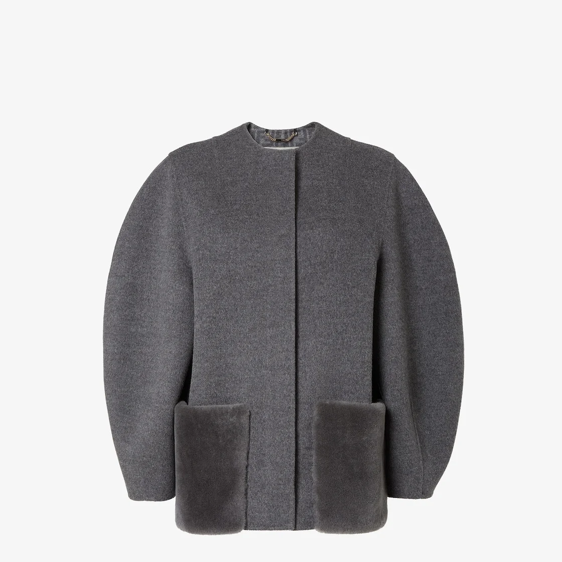 Single-breasted short jacket. Cocoon-style garment with wide long sleeves and crew neckline. Concealed front closure. Made of wool double fabric in a gray melange color. Lining customized with the tone-on-tone FF motif. Finished with gray shearling patch pockets. Made in Italy Composition: 99% fleece wool, 1% silk, 6 buttons: mother of pearl, pockets: 100% ram fur Size worn: 38 IT. The model is 178 cm tall Product Code: FJ7647A5HDF1M2T