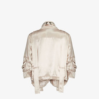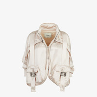 Oversize blouson with high collar and long sleeves. Snap closure. Made of light beige viscose satin, decorated with zipper, long tone-on-tone satin straps and Baguette pockets with metal FF buckle. Made in Italy Composition: 100% viscose, lining: 100% viscose Model height: 178 cm Size worn: 38 IT Product Code: FJ7405ANQ9F084J