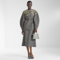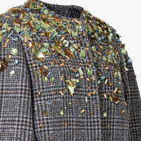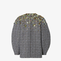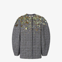Single-breasted short jacket. Cocoon-style garment with wide long sleeves and crew neckline. Concealed front closure. Made of a blend of wool and cotton tweed in a smoke gray check pattern. Embellished with hand-crafted embroidery: crystals of different shapes and sizes that create depth and movement, while fabric shapes decorated with crystals appear to emerge from the surface, fading into a gradient effect. Made in Italy Composition: 91% fleece wool, 7% cotton, 2% polyamide, lining: 100% viscose Size worn: 38 IT. The model is 178 cm tall Product Code: FJ7647AYNCF1T6F