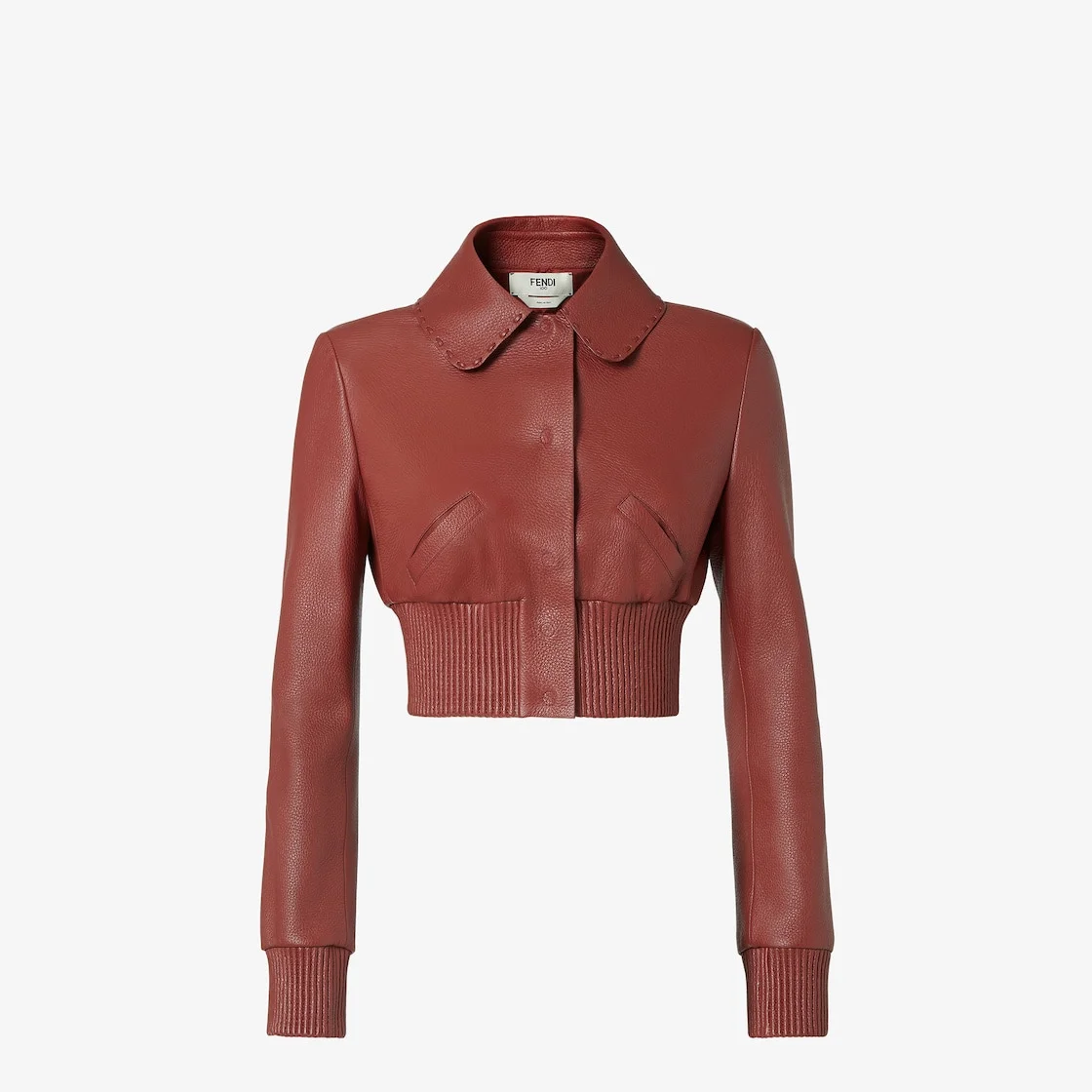 Cropped jacket with shirt collar and wide elastic waist. Slanted welt pockets and elastic cuffs. Front closure with concealed snap buttons. Made of rust-colored deerskin. Finished with macro hand-sewn stitching, an emblem of the iconic Selleria stitching handed down through generations of Fendi artisans since 1925. Silver Selleria plaque and customized micro FF jacquard lining. Made in Italy Composition: 100% deer leather, 100% lamb leather, 100% viscose, tag: 100% silver Size worn: 38 IT. The model is 180 cm tall Product Code: FPJ894ARTZF1T6K