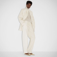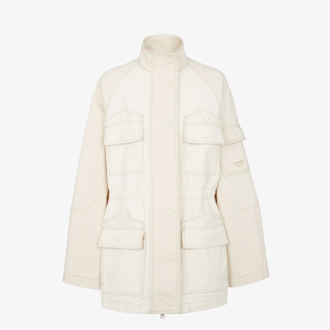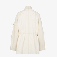 Parka-style blouson with high collar and adjustable internal drawstring waist. Raglan sleeves and four flap pockets on the front. Concealed double-slider zip and press-stud fastening. Made of two-tone denim in shades of white. Embellished with contrasting stitching and matching embroidered Fendi Roma logo on flap pocket on the left-side sleeve. Made in Italy Composition: 100% cotton Fit: Over Size worn: 38 IT. The model is 177 cm tall Product Code: FLF802AT23F08QQ
