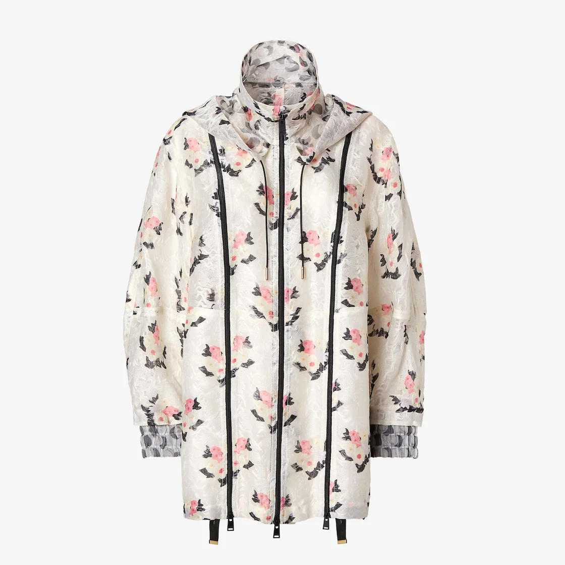 Parka jacket with high collar and drawstring hood. Elastic strap inserted at the hem, with buttonhole adjustment, to modify the fit and define the volume of the silhouette. Elastic cuffs and front closure with double slider zipper. Made of dark white organza lace with the collection’s Fendi Bouquet motif printed all over in pink and black. Symmetrical two-way zipper motif on the front. Made in Italy Composition: 56% silk, 44% polyamide Product Code: FJ7715AW9FF0ZNM