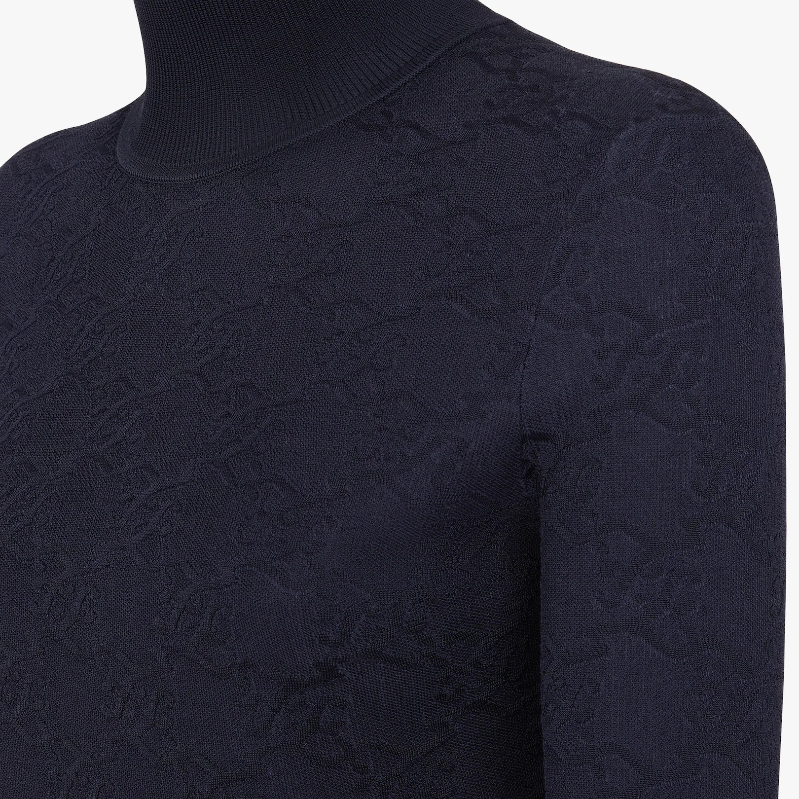 Fitted long-sleeved sweater. Pointed collar and shirt cuffs. Concealed closure. Made in a blue viscose knit, with matching color jacquard FF Karligraphy motif. Features a cotton lining that is soft on the skin. Made in Italy Composition: 50% Viscose, 50% Cotton Product Code: FZX764AHE8F1FLH