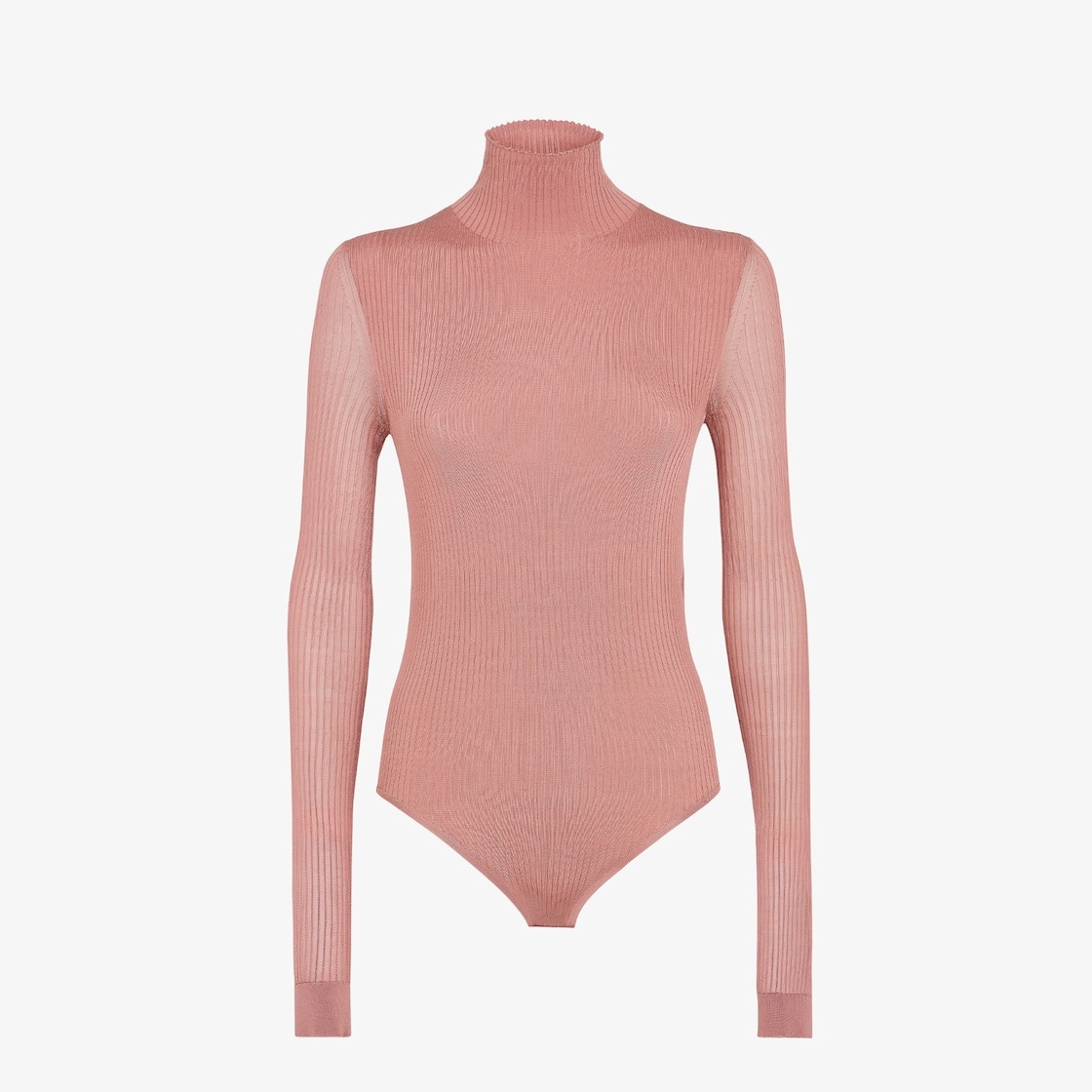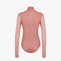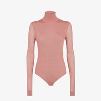 Bodycon bodysuit with a high collar and long sleeves. Crotch closure. Made of light pink extra-fine viscose yarn with ribbing. Small chain with Fendi Roma tag in palladium-finish metal at the back of the neck. Made in Italy Composition: 100% viscose Size worn: 38 IT. The model is 178 cm tall Product Code: FZXC47ASOVF1PNJ