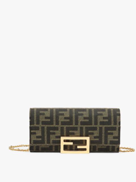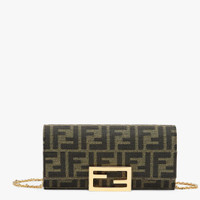 Baguette continental wallet with detachable, thin chain shoulder strap. The interior is laid out like a wallet with two gusseted compartments, a zip pocket, two flat pockets and ten card slots. Made of fabric with iconic brown jacquard FF motif. Dark brown leather lining. Gold-finish metalware. Made in Italy Composition: 62% Polyester, 33% Cotton, 5% Resin, interior: 100% Calfskin, 48% Polyamide, 46% Polyester, 6% Resin Measurements: - Height: 9 cm - Depth: 1 cm - Length: 19 cm Product Code: 8M0365A98PF0A6E