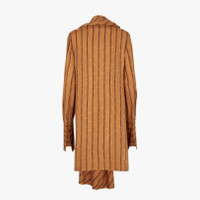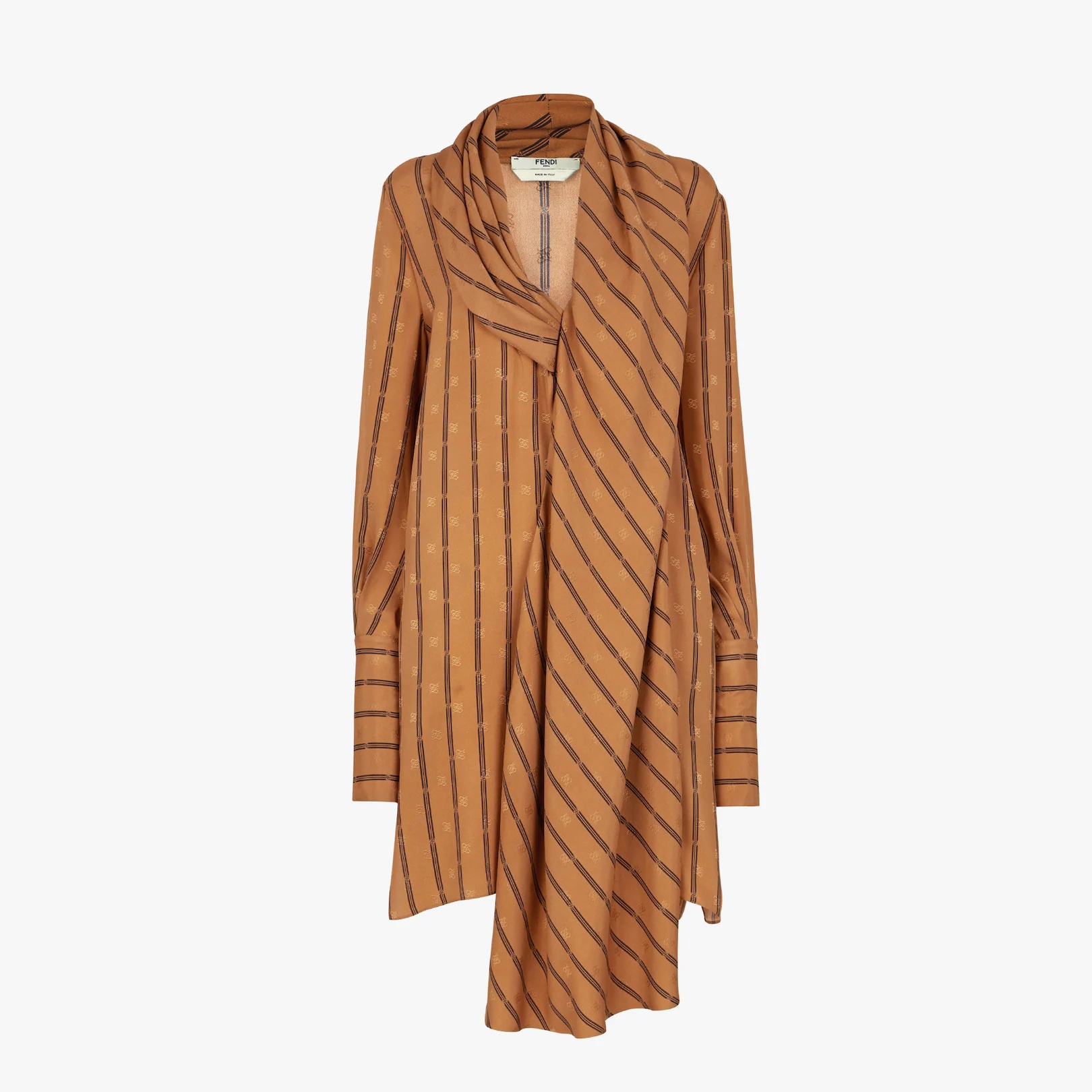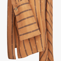 Short dress with V neck and long foulard. Made of light brown satin crêpe. Decorated with all-over printed stripes Karligraphy motif in a contrasting shade. Embellished with matching FF Karligraphy pattern. The sleeves are finished with wide cuffs and cufflink Fendi O’Lock buttons. Made in Italy Composition: 100% Silk Product Code: FDB659AGTQF1ENR