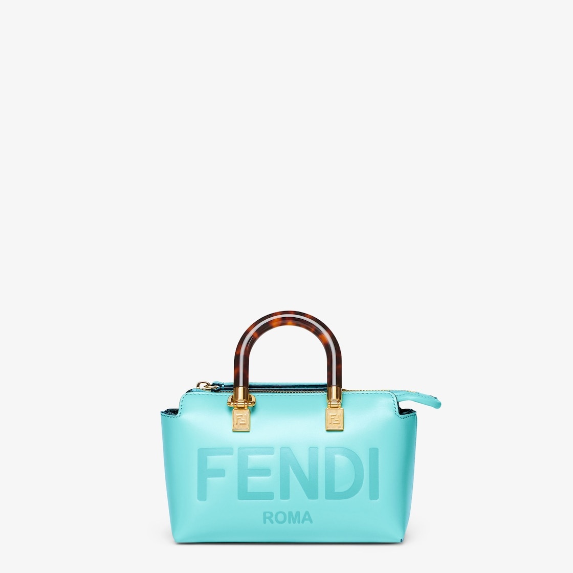 Iconic mini By The Way Boston bag made of turquoise leather with hot-stamped FENDI ROMA lettering and rigid tortoiseshell-effect plexiglass handles. Zipper closure. Featuring an interior lined in FF fabric and gold-finish metalware. The bag can be carried by hand with the handles, or worn either on the shoulder or cross-body with the detachable shoulder strap. Made in Italy Composition: 100% calf leather, inside: 64% polyester, 23% cotton, 13% polyurethane Model height: null Size worn: null Measurements: - Height : 12 cm - Depth : 9 cm - Width : 20.5 cm Product Code: 8BS067ABVLF1JTX