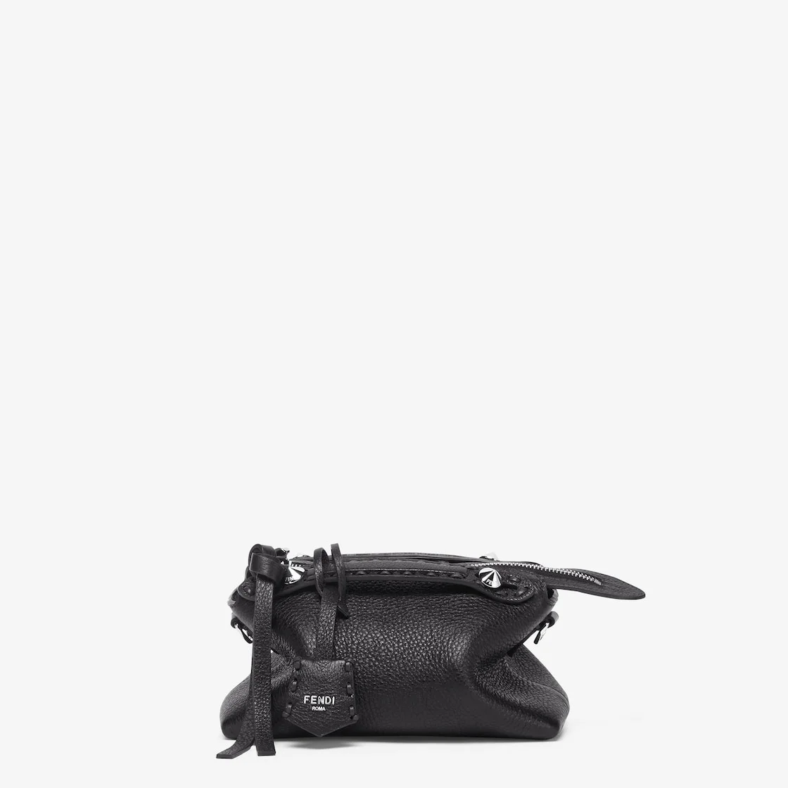 Iconic mini By The Way Selleria bag, reworked for the Fall-Winter 2024/25 fashion show for a relaxed, lightweight look. Made with 156 hand-sewn tone-on-tone macro topstitches, an emblem of the iconic Selleria workmanship handed down through generations of Fendi artisans since 1925. Made of black Cuoio Romano leather, calfskin with a characteristic natural grain, produced with a metal-free tanning process. Featuring a leather-lined interior, hand-stitched Selleria stamp in Cuoio Romano leather and palladium-finish metalware. Customizable pendant and long zipper-pull with knot. The bag can be carried by hand with the handles or worn either on the shoulder or cross-body with the adjustable, detachable shoulder strap that can be knotted. Made in Italy Composition: 100% calfskin, inside: 100% calfskin Product Code: 8BS098ASU2F0GXN