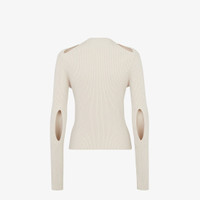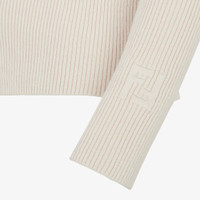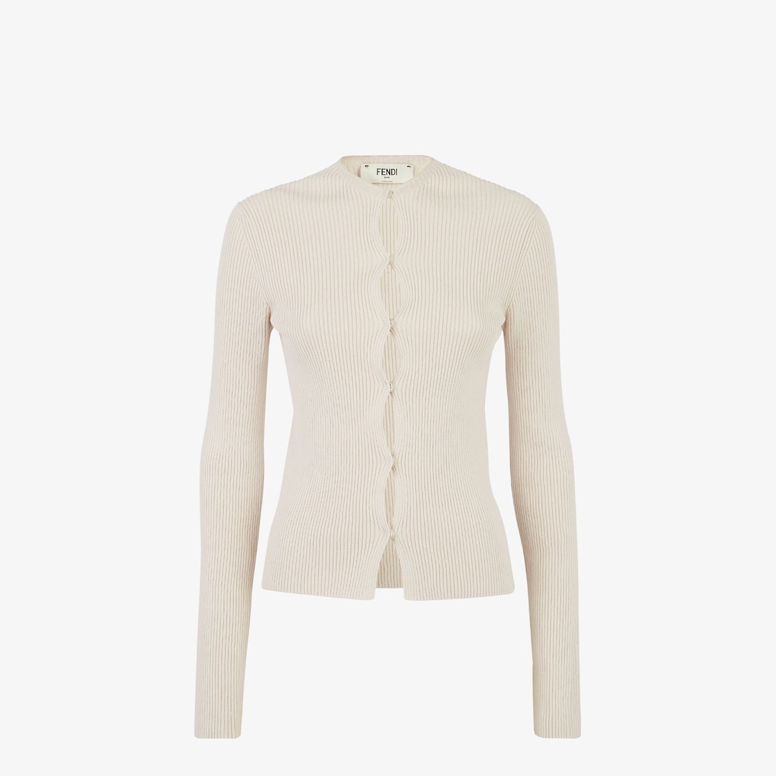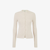 Slim-fit cardigan with crew neck and extra-long sleeves. Made of light beige cotton jersey in a rib knit. The front closure with snaps creates a cut-out motif also repeated on the shoulders and elbows. Embellished with FF detail on the left sleeve cuff. Made in Italy Composition: 80% Cotton, 15% Polyamide, 5% Elastane Model height: 180 cm Size worn: 38 IT Product Code: FZC963ANJBF084J