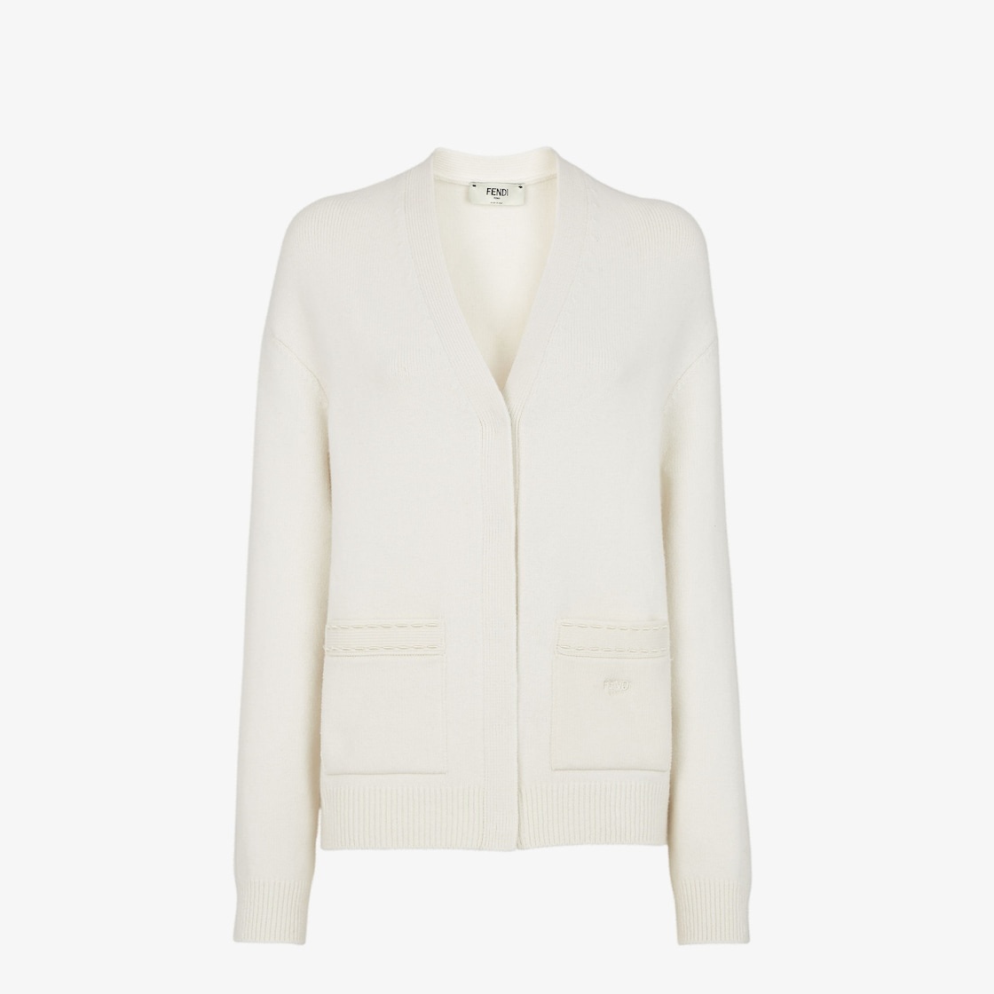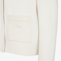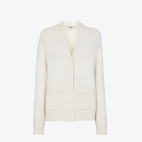 Cardigan with V neck and sleeves with dropped armhole. Patch pockets on the front and concealed front closure. Made of white cashmere jersey. The pockets are embellished with the Fendi logo and hand-sewn tone-on-tone macro Selleria topstitches, an emblem of the iconic Selleria workmanship handed down through generations of Fendi artisans since 1925. Ribbed cuffs and edges. Made in Italy Composition: 100% cashmere Fit: Regular Product Code: FZE505ASJJF08QQ