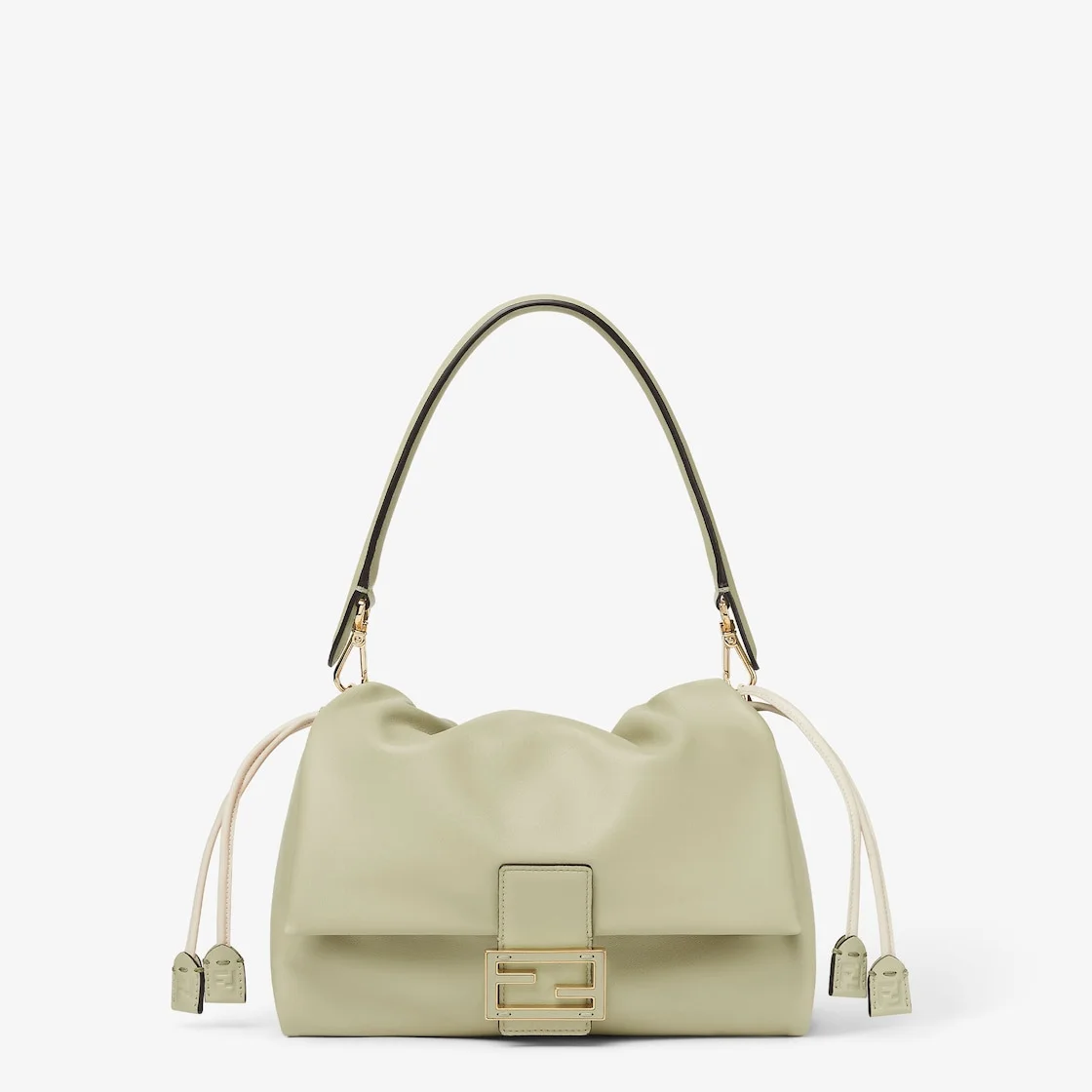 Iconic medium Mamma Baguette bag, created in the late 1990s as a larger version of the iconic Baguette, hence the name Mamma Baguette. Updated for the Spring/Summer 2025 fashion show with a soft, deconstructed look, it retains the original elements of the bag and the iconic under-the-arm design. Made of soft, sage green nappa leather embellished with an oversized metal FF clasp with tone-on-tone leather insert. Large suede-lined internal compartment with drawstring closure featuring cream-colored leather ties and customized details. Featuring a front flap and magnetic clasp. Gold-finish metalware. The bag can be worn either on the shoulder or cross-body thanks to the handle and shoulder strap, both detachable. Made in Italy Composition: 100% lamb leather, inside: 100% calf leather Product Code: 8BR833AQ0DF1AST
