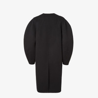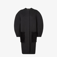 Single-breasted midi coat. Cocoon-style garment with wide long sleeves and crew neckline. Concealed front closure. Made of black wool double-sided fabric. Lining customized with a gray FF motif. Embellished with tone-on-tone shearling patch pockets, distinguished by natural and slight color differences that vary from item to item. Made in Italy Composition: 99% fleece wool, 1% silk, lining: 100% silk, 7 buttons: mother of pearl, pockets: 100% ram fur Size worn: 38 IT. The model is 180 cm tall Product Code: FF6165A5HDF1FL8