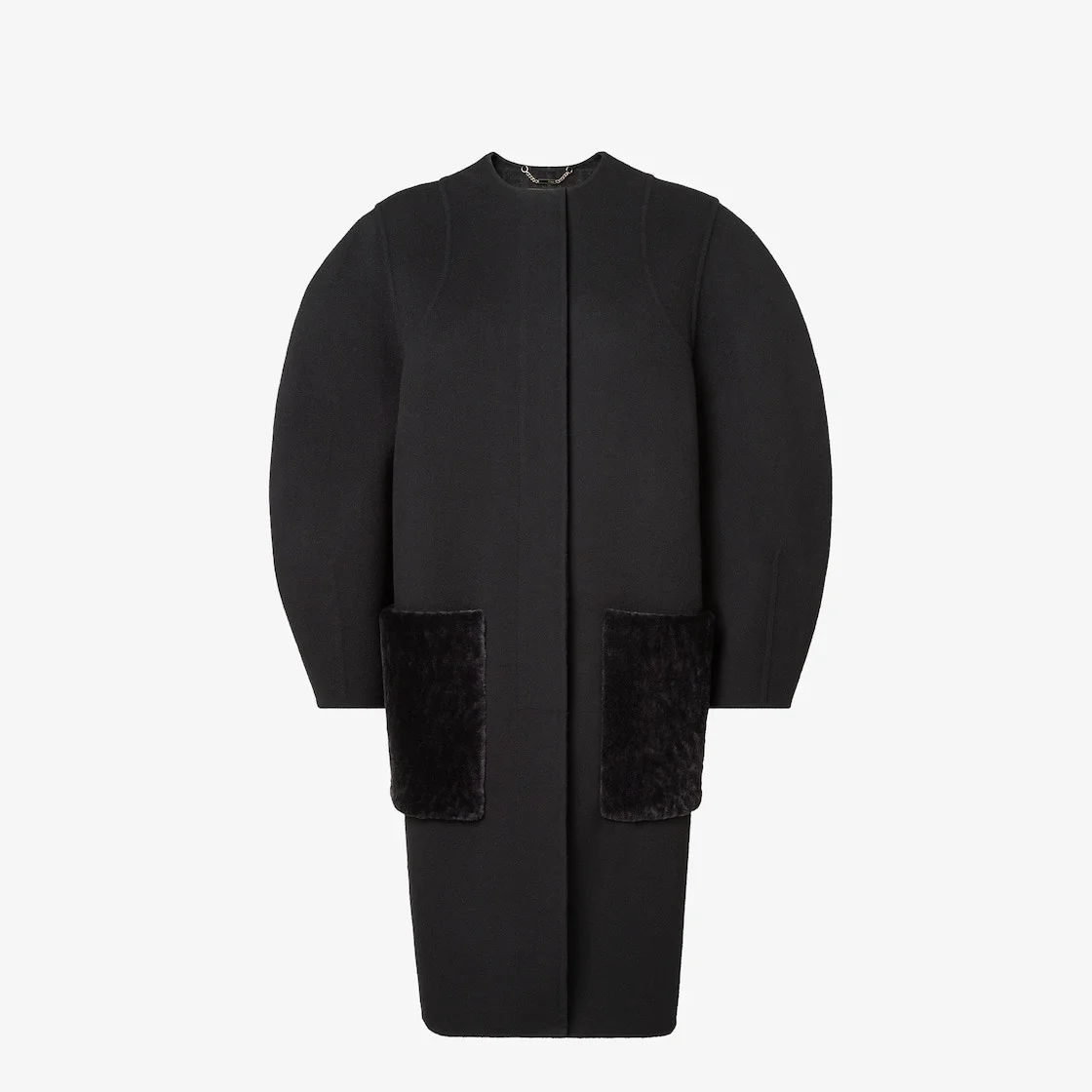 Single-breasted midi coat. Cocoon-style garment with wide long sleeves and crew neckline. Concealed front closure. Made of black wool double-sided fabric. Lining customized with a gray FF motif. Finished with tone-on-tone shearling patch pockets. Made in Italy Composition: 99% fleece wool, 1% silk, lining: 100% silk, 7 buttons: mother of pearl, pockets: 100% ram fur Size worn: 38 IT. The model is 180 cm tall Product Code: FF6165A5HDF1FL8