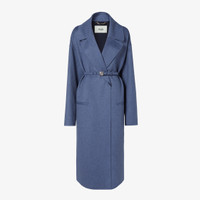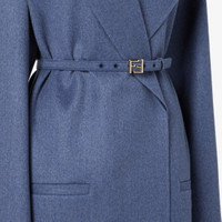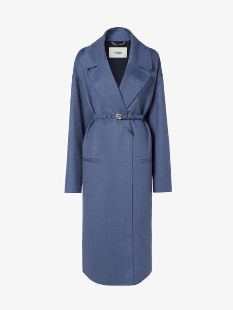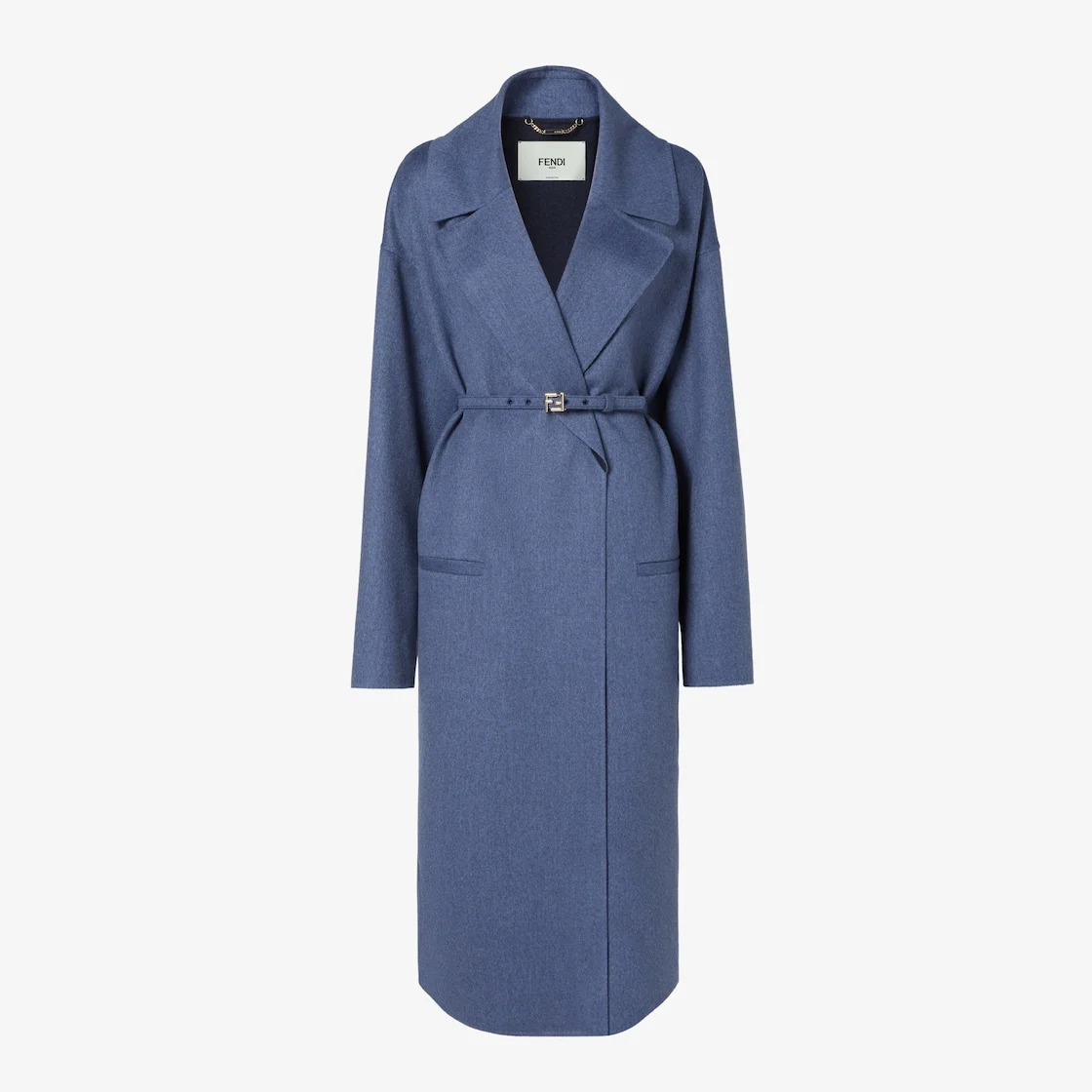 Oversize coat with a large collar and fur lapels. Low-set sleeves and horizontal welt pockets on the sides. Fastens with matching belt. Made of blue lightweight double-face cashmere. Dark blue lining. Embellished with a matching embroidered logo on the left-hand cuff. Paired with a matching double belt in cashmere: one with a tone-on-tone covered buckle, the other with a palladium-finish metal FF buckle. Made in Italy Composition: 96% cashmere, 4% elastane, lining: 100% silk, 6 buttons: mother of pearl, neck: 100% mink fur Product Code: FF6172ANQ1F1KY2