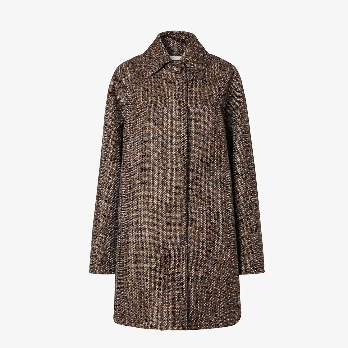 Single-breasted midi coat with shirt collar and long sleeves with dropped shoulders. Ample volume at the back with gathered elastic insert at the waist. Side pockets and hidden front fastening with first visible button. Unlined. Made of rust-colored melange wool and alpaca tweed. Made in Italy Composition: 43% wool, 40% alpaca, 17% polyamide, 100% viscose, 6 buttons: mother of pearl Size worn: 38 IT. The model is 180 cm tall Product Code: FJ7670AYN5F1T6K
