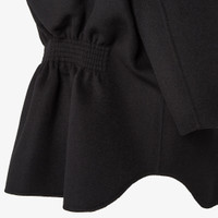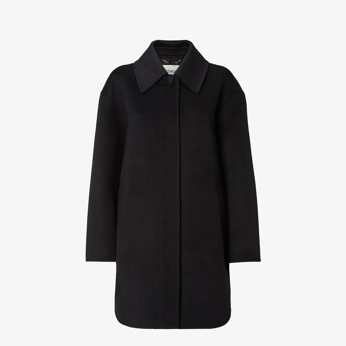 Single-breasted midi coat with shirt collar and long sleeves with dropped shoulders. Ample volume at the back with gathered elastic insert at the waist. Side pockets and hidden front closure with first visible button. Unlined. Made of black wool double-sided fabric. Lining customized with a gray FF motif. Made in Italy Composition: 99% fleece wool, 1% silk, lining: 100% silk, 6 buttons: mother-of-pearl Product Code: FJ7670A5HDF1FL8