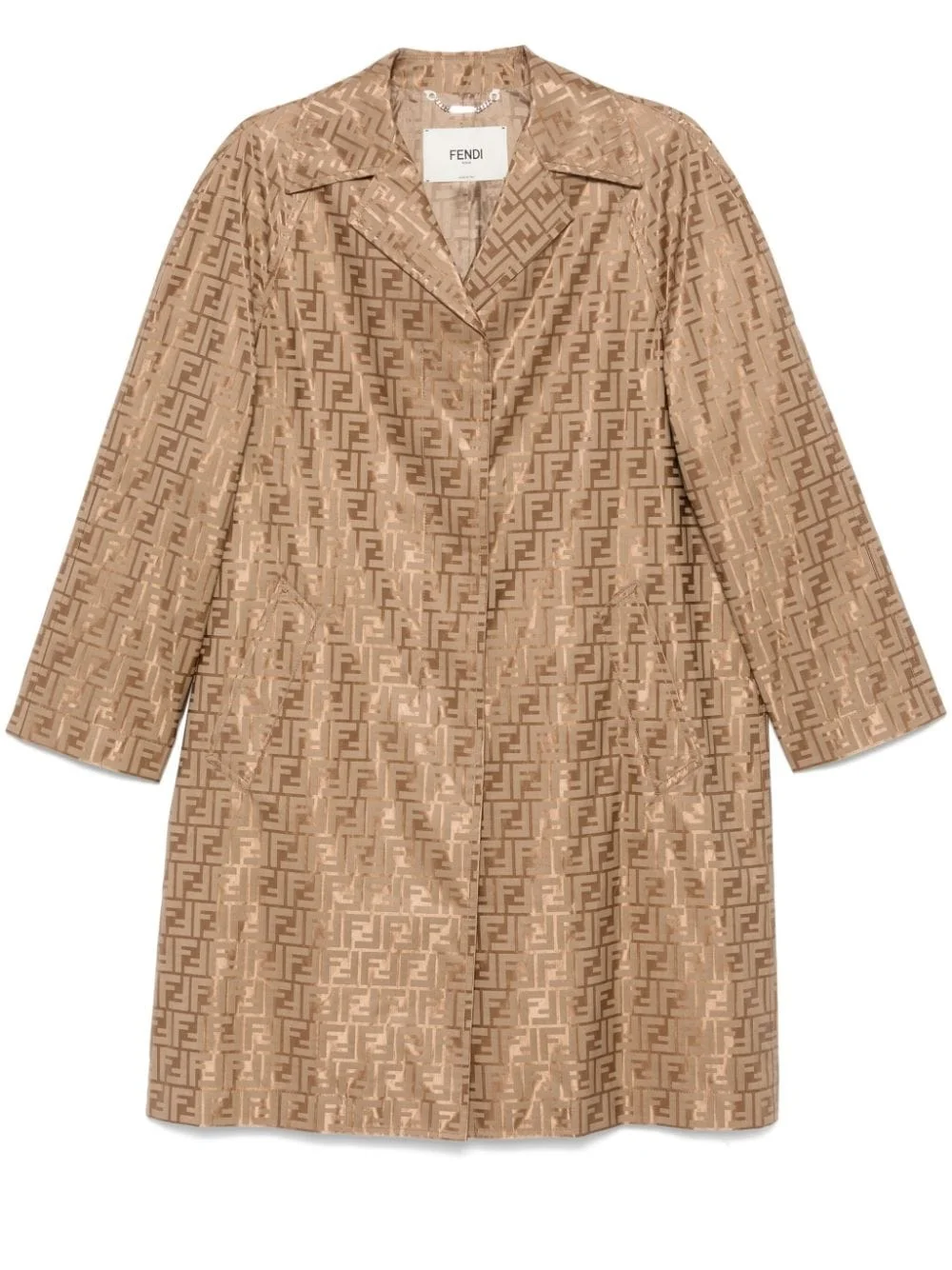 FF-printed coat Highlights - Beige - Cotton blend - Ff-logo print - Concealed front button fastening - Notched lapels - Long sleeves - Two side welt pockets - Central rear vent - Full lining - Straight hem Made in Italy Composition Outer: Cotton 64%, Polyamide 36% Lining: Viscose 100% SIZE & FIT Model measurements Height 5 ft 10 in(1.78 m) Bust/Chest 31.49 in(80 cm) Hips 37 in(94 cm) Waist 23.62 in(60 cm) FittingInformation Designed to be unstructured, offering a loose fit throughout Made from a midweight non-stretch fabric Washing instructions Dry Clean Only