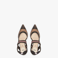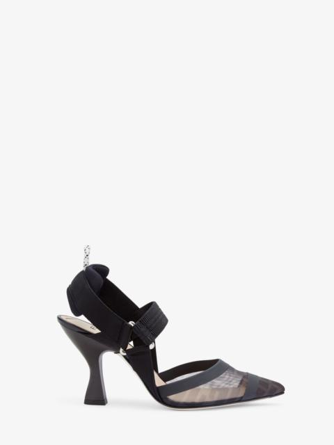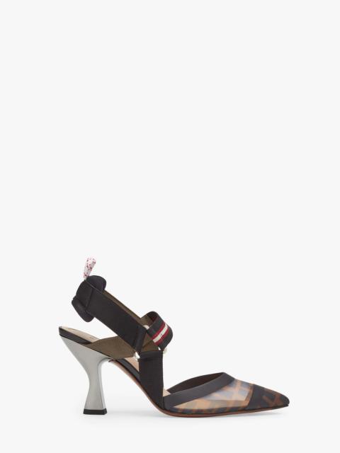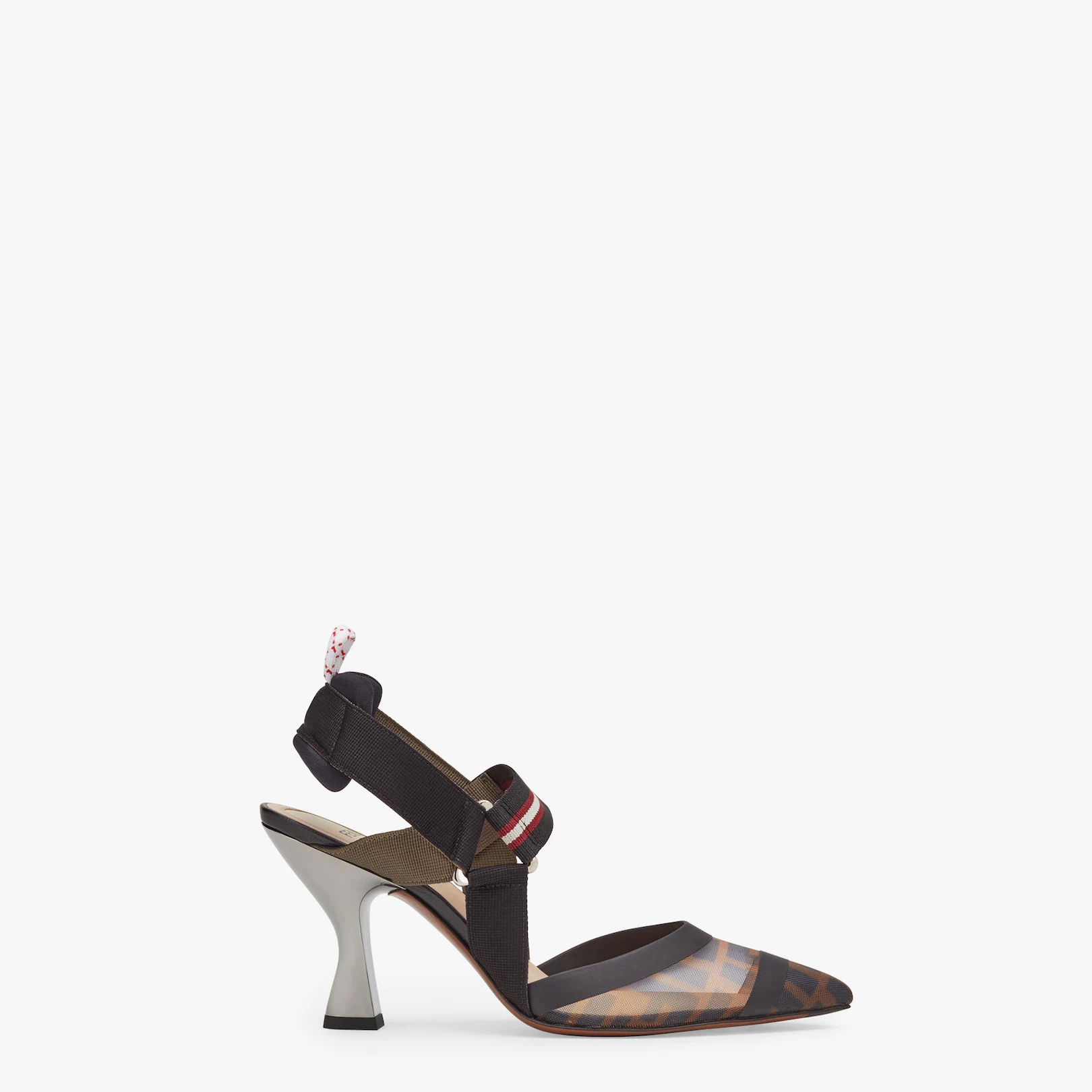 Colibrì slingbacks with elastic ribbons around the foot. The sole is finished with rubber inserts. Made of tech mesh fabric with FF print. Finished with contrasting heat seals and two-tone ribbon straps. The padded cushion and trekking shoe tab add a sporty touch. Plated metal heel. Made in Italy Composition: 100% polyamide, 100% polyurethane + ribbon: 90% viscose, 10% polyester Model height: null Size worn: null Measurements: - Heel height : 85 mm Product Code: 8J6851A2D7F1OTR