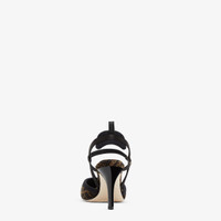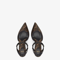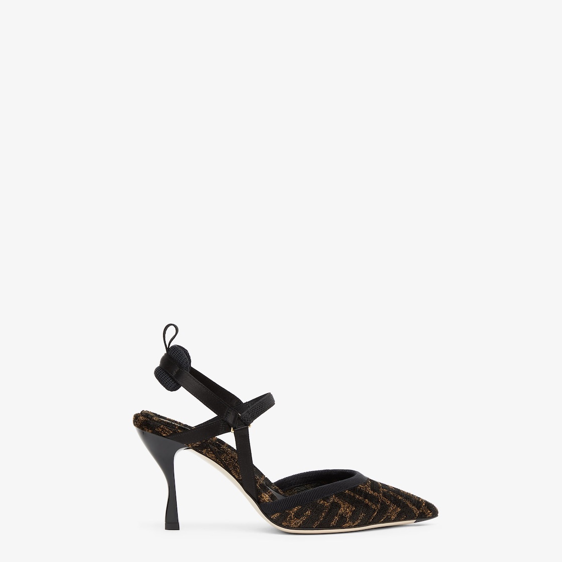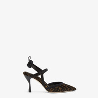 Streamlined and feminine Colibrì Lite slingbacks with narrow elastic ribbons that wrap around the foot. The sole is embellished with rubber inserts. Made of chenille with a tapestry-effect black and brown FF motif. The padded cushion and hiking shoe tab add a sporty touch. Black enameled heel. Made in Italy Measurements: - Heel height : 85 mm Composition: 64% viscose, 20% polyester, 16% cotton, 72% viscose, 28% silk, inside: 52% viscose, 28% cotton, 20% polyester Product Code: 8J8361AKXYF13TU