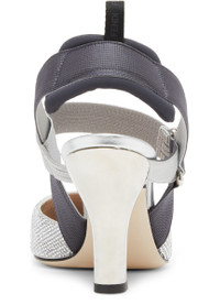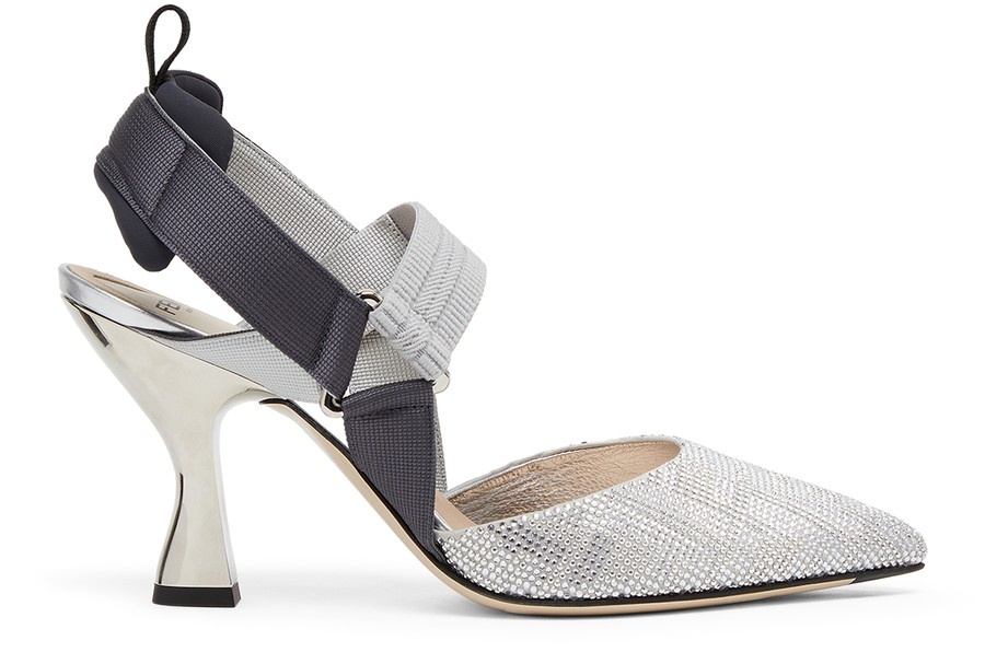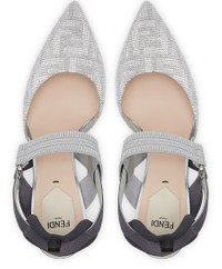 Colibrì slingbacks with elastic ribbons around the foot. The sole is embellished with rubber inserts. Made with-coloured rhinestones and an FF motif. The padded cushion and hiking shoe tab add a sporty touch. enamelled heel. Made in Italy DESCRIPTION - Colibrì slingbacks DETAILS AND CARE MATERIAL: 100% polyesterinside: / 100% goatleather HEEL HEIGHT: 8.5 cm / 3.3 " COLOR: argent COUNTRY OF MANUFACTURE: Italy PRODUCT CODE: FENV49GZSILI21A100