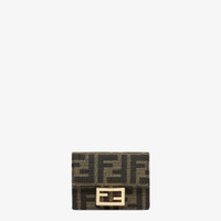 Compact, tri-fold Baguette wallet with large internal banknote compartment, three concealed card holders and an external coin purse with a press-stud fastening. Made of fabric with iconic brown jacquard FF motif. Dark brown leather lining. Gold-finish metalware. Made in Italy Composition: : 62% Polyester, 33% Cotton, 5% Resin, interior: 100% Calfskin, 48% Polyamide, 46% Polyester, 6% Resin Model height: null Size worn: null Measurements: - Height: 7.5 cm - Depth: 3 cm - Width: 9.5 cm Product Code: 8M0395A98PF0A6E