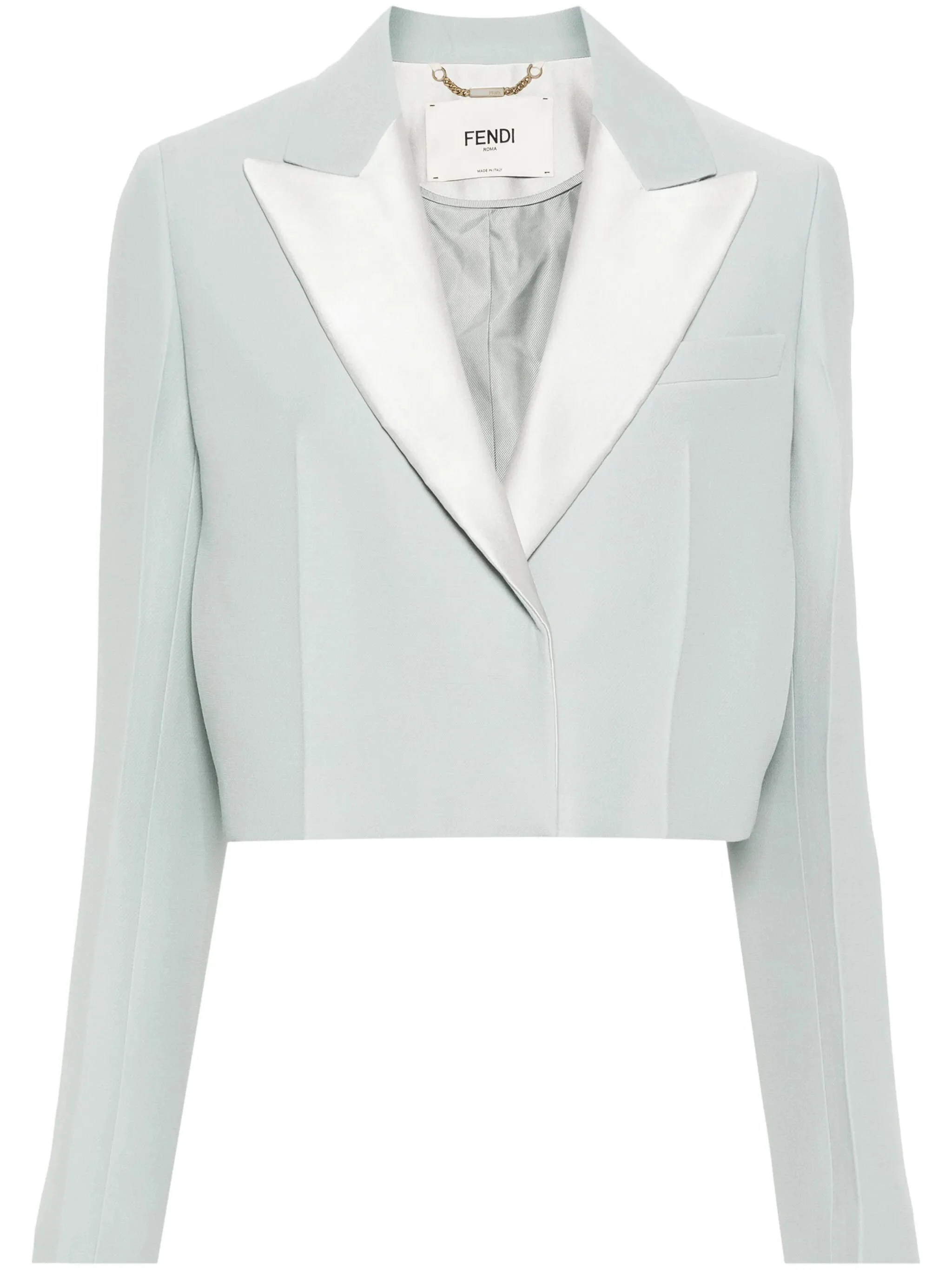 light blue wool-silk blend textured finish peak lapels contrasting panel detail long sleeves split cuffs chest welt pocket pressed crease internal logo tag cropped concealed front button fastening - Color: BLUE - Made in: Italy - Designer Style ID: AC4G FJ7491 F08S8 Composition and care Outer Composition Silk: 23.0%, Lining Composition Cupro: 100.0%, Outer Composition Wool: 77.0%