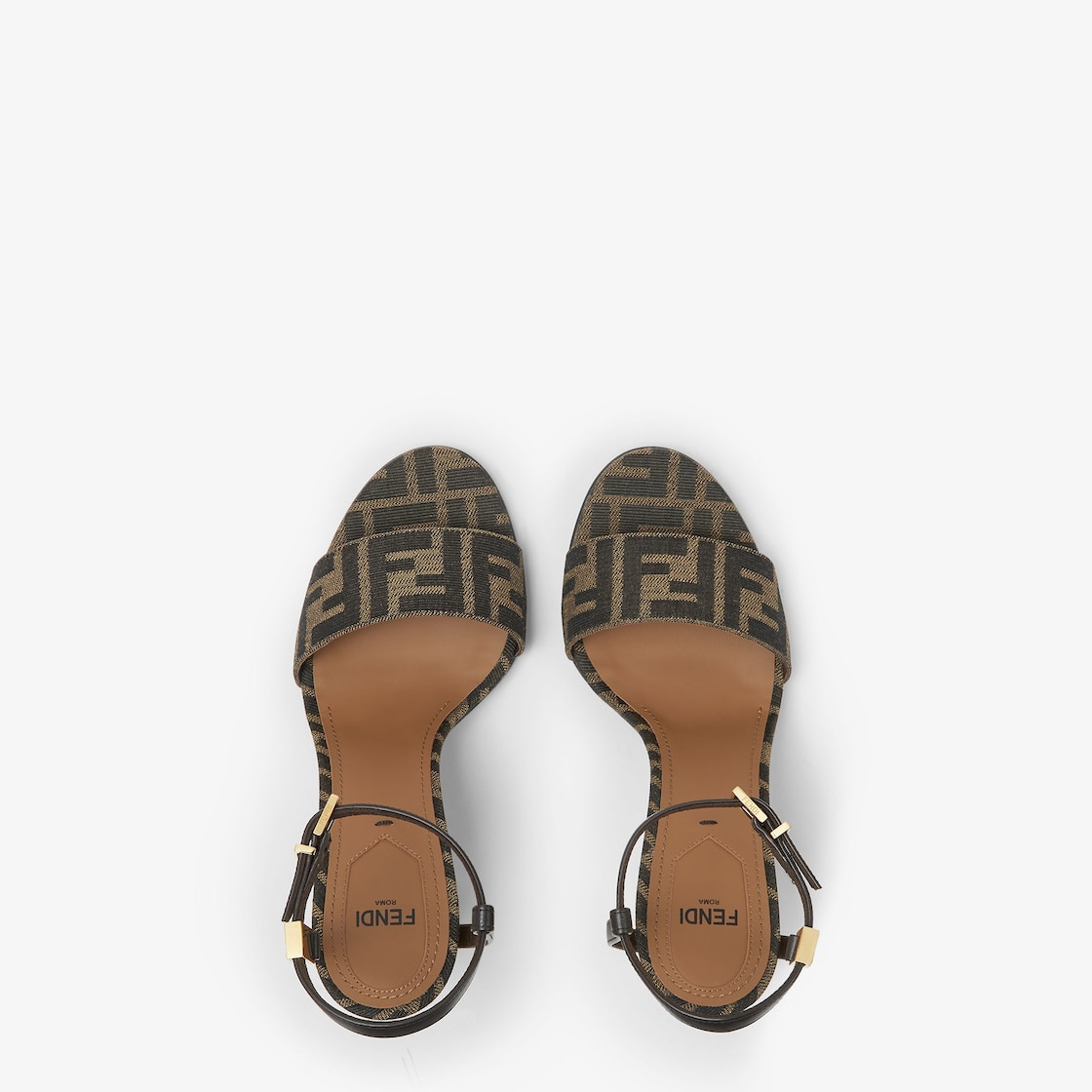 Delfina round-toe sandals with an ankle strap. Made of FF jacquard fabric. Details in brown leather. Heel with cut-out detail and gold-colored metal FF motif. Made in Italy Composition: 65% polyamide, 35% cotton, 100% calf leather, inside: 100% goat leather Model height: null Size worn: null Measurements: - Heel height : 95 mm Product Code: 8X8442AJZFF1D1C