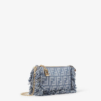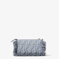 Baguette pouch made in denim-effect FF jacquard in shades of blue. Zipper closure with a zipper pull featuring the iconic FF motif and fringed edges. Lined interior, pocket with card holder slots and gold-finish metalware. It can be carried by hand, under the arm or cross-body thanks to the short, slim chain shoulder strap and long leather shoulder strap, both detachable. Holds a 6.7-inch smartphone and keys. The card holder is integrated inside the bag. Made in Italy Composition: 34% cotton, 27% polyamide, 21% polyurethane, 18% polyester, 100% calf leather, inside: 63% cotton, 34% polyester, 3% acrylic Product Code: 8BS073AUT4F1SXQ