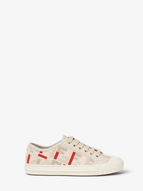 Domino sneakers with rubber cupsoles. Made of beige cotton canvas with FF embroidery in multicolored yarn in red, pink and dove gray. Trimmed with tone on tone grosgrain ribbon. The white sole with contrasting bottom features a combination of embossed textures, the FF pattern superimposed on the toe and the Fendi Roma logo on the heel. Extra white laces. Made in Italy Composition: 100% cotton, embroidery: 100% polyethylene terephthalate, inside: 100% cotton Product Code: 8E8325ARIVF1SZE