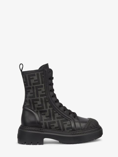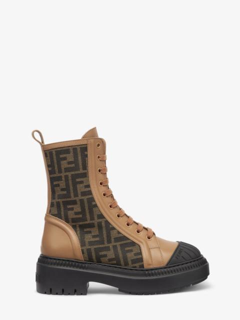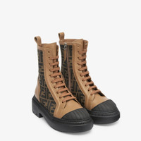 Fendi Domino combat boots with laces and side zipper on the inside. Made of beige leather. Fabric insert with brown and tobacco FF jacquard motif. Rubber cupsole with embossed FF motif on the toe. Made in Italy Measurements: - Heel height : 50 mm Composition: 100% Calfskin, 65% Polyester, 35% Cotton, interior: 100% Lambskin Product Code: 8T8353AJZFF1ICN