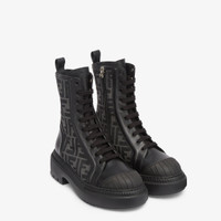 Fendi Domino combat boots with laces and side zipper on the inside. Made of black leather. Made of fabric with black and gray FF jacquard motif. Rubber cupsole with embossed FF motif on the toe. Made in Italy Measurements: - Heel height : 50 mm Composition: 100% Calfskin, 65% Polyester, 35% Cotton, interior: 100% Lambskin Product Code: 8T8353AJZFF0TUY