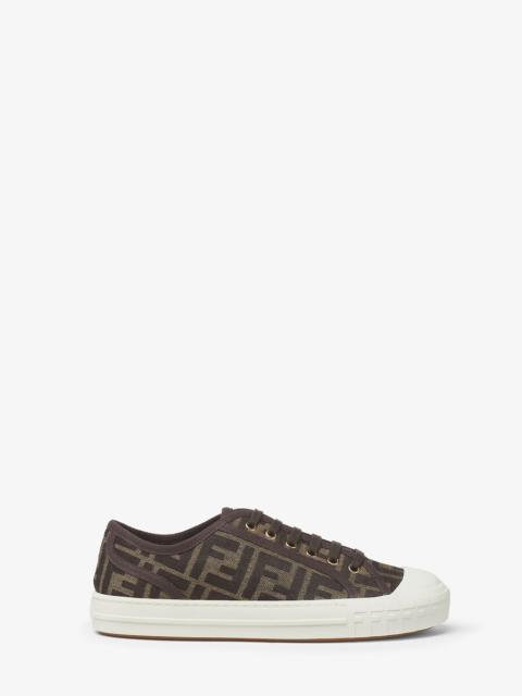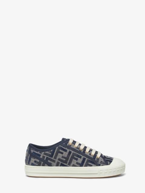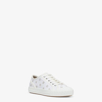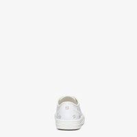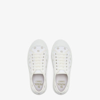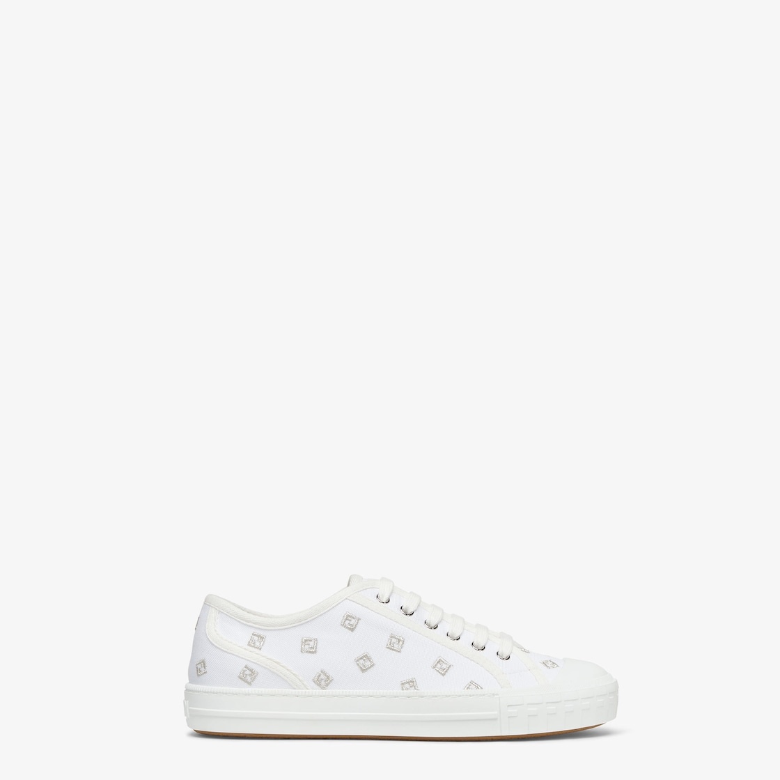 Domino sneakers with rubber cupsoles. Made of white canvas with silver micro FF embroidery. Trimmed with tone on tone grosgrain ribbon. The white sole with contrasting bottom features a combination of embossed textures, the FF pattern superimposed on the toe and the Fendi Roma logo on the heel. Extra white laces. Made in Italy Measurements: - Heel height : 20 mm Composition: 100% cotton, interior: 100% cotton Product Code: 8E8325AQZ5F1NLG