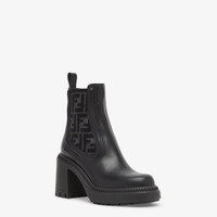 Domino biker boots with round toes and elastic inserts at the sides. Platform sole and rubber heel. Made of black leather and part of the collection curated with designer Stefano Pilati. Embellished with black and gray FF stretch fabric. Made in Italy Measurements: - Heel height : 65 mm Composition: 100% calf leather, interior: 100% calf leather Product Code: 8T8471AQ60F1NLV