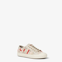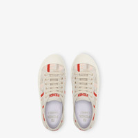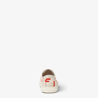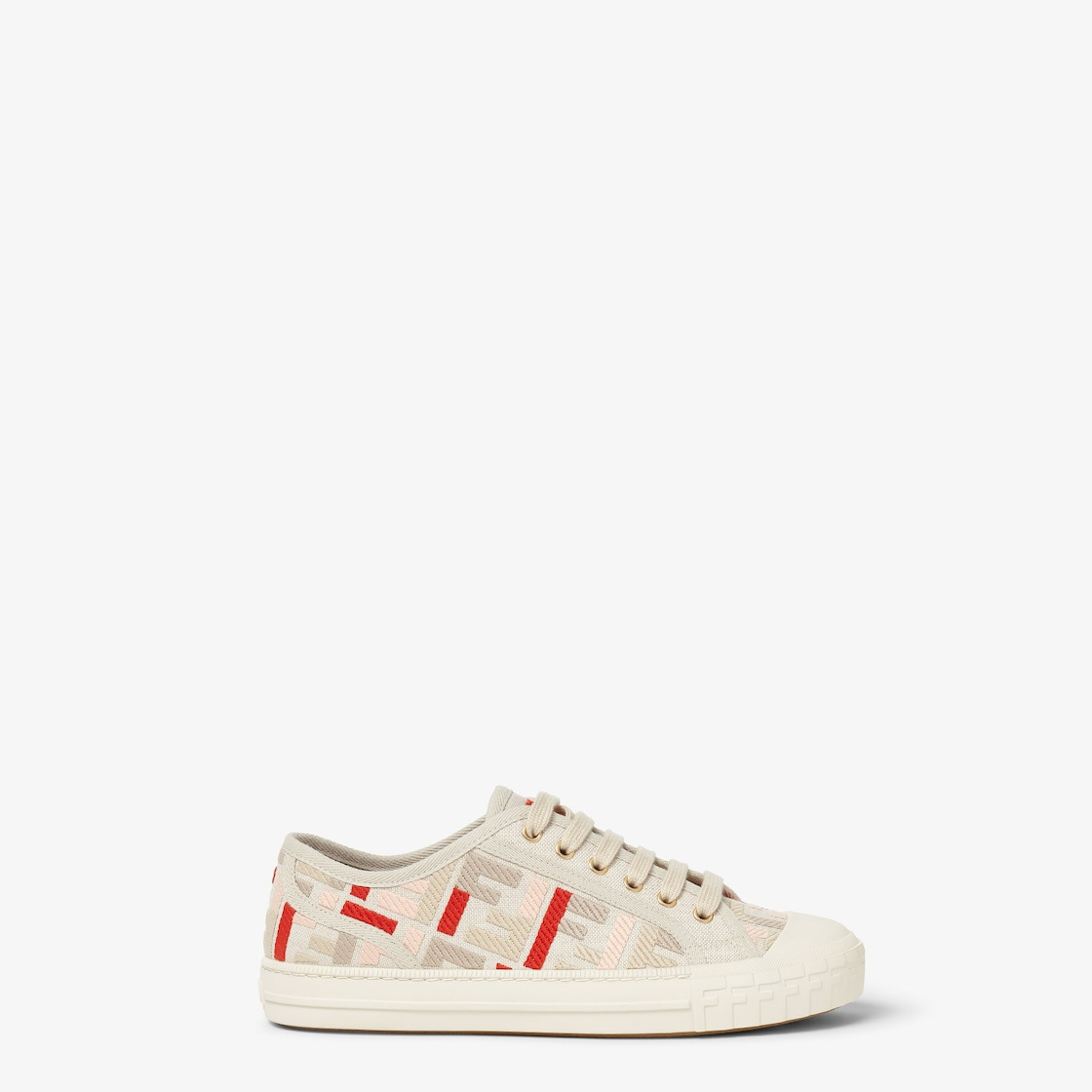 Domino sneakers with rubber cupsoles. Made of beige cotton canvas with FF embroidery in multicolored yarn in red, pink and dove gray. Trimmed with tone on tone grosgrain ribbon. The white sole with contrasting bottom features a combination of embossed textures, the FF pattern superimposed on the toe and the Fendi Roma logo on the heel. Extra white laces. Made in Italy Composition: 100% cotton, embroidery: 100% polyethylene terephthalate, inside: 100% cotton Product Code: 8E8325ARIVF1SZE