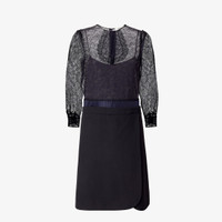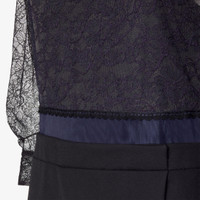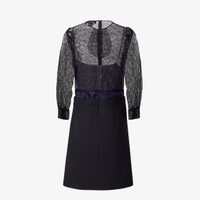 Trompe-l'oeil effect midi dress with round neckline and 3/4 sleeves. Shirt cuffs and wrap skirt. Fastening on the back. Lined. Made with grain de poudre skirt and lace top in blue. Finished with trimming details and tone-on-tone lace jabot motif on the front. Made in Italy Composition: 51% viscose, 49% polyamide, 100% fleece wool, 100% polyamide, 53% polyamide, 47% viscose, lining: 100% silk, 3 buttons: 100% mother of pearl Size worn: 38 IT. The model is 180 cm tall Product Code: FDD478AVJCF1M2F