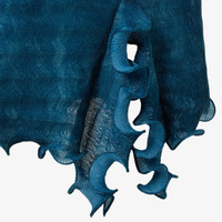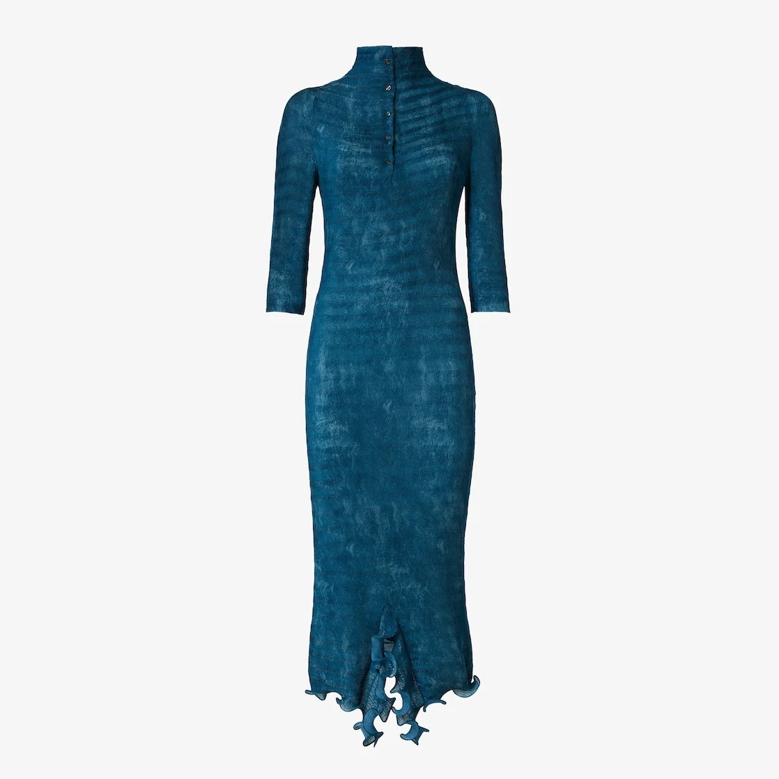 Close-fitting midi dress. High neck and 3/4 sleeves. Polo collar closure with mother-of-pearl buttons. Made of pleated fabric with an abstract shaded petrol blue print. Finished with ruffles on the asymmetrical hem with a small central slit on the front. Made in Italy Composition: 100% polyester, 6 buttons: mother of pearl Size worn: 38 IT. The model is 178 cm tall Product Code: FDD417AVJEF1TRR