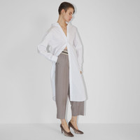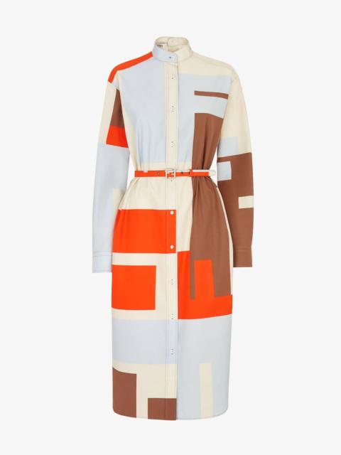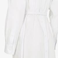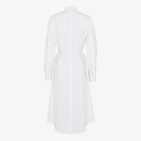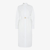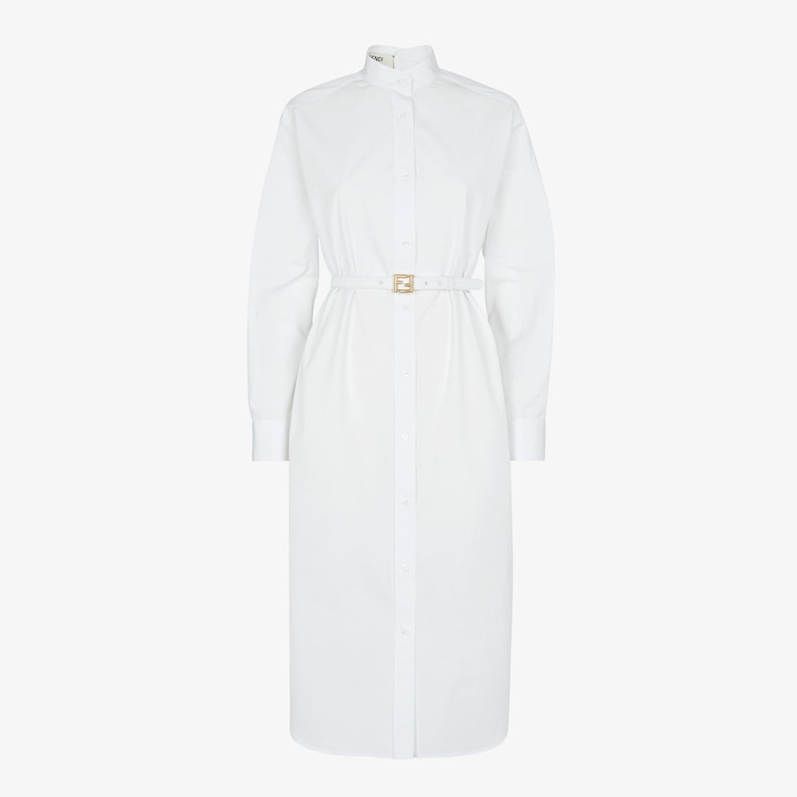 Shirt dress with mandarin collar. Long sleeves with shirt cuffs and rounded hem. Full-length button closure, front and back. Made of white cotton poplin. Leather belt with metal FF buckle. Embellished with matching FF logo embroidered on the left cuff. Made in Italy Composition: 100% cotton, buttons: 100% mother of pearl Size worn: 38 IT. The model is 179 cm tall Product Code: FDD008ARU3F1F3H