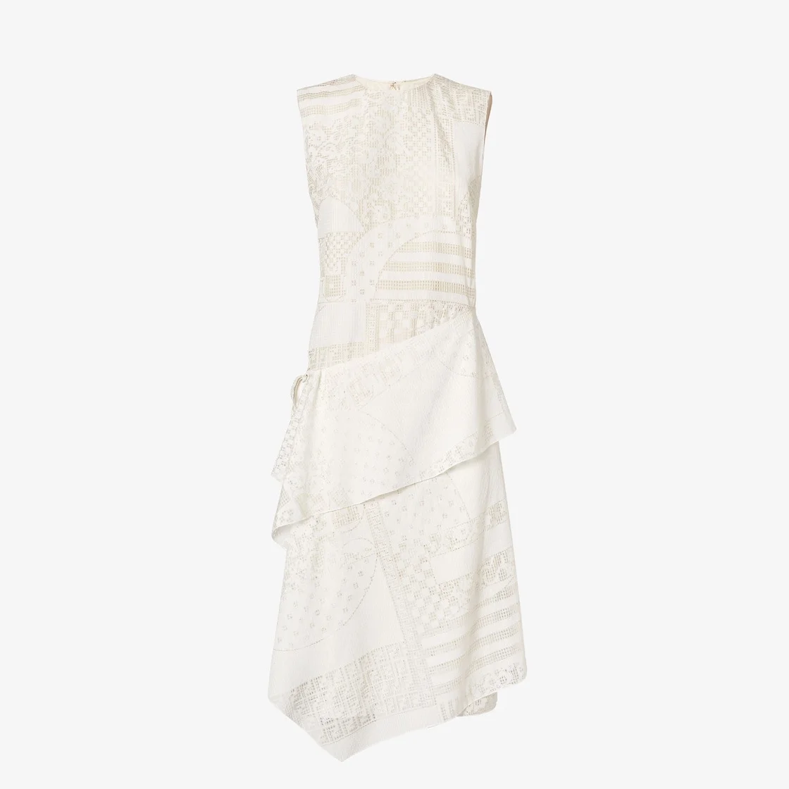 Sleeveless midi dress, featuring a side panel to tie at the waist for a wrap-over effect or left free at the side to create an asymmetric volume on the side. Lined in silk. Made of white viscose and silk with a burnout patchwork motif that depicts a combination of logos and archive patterns. Made in Italy Composition: 58% viscose, 42% silk, 67% viscose, 33% silk, lining: 100% silk Size worn: 38 IT. The model is 179 cm tall Product Code: FDD360AUJXF0ZNM