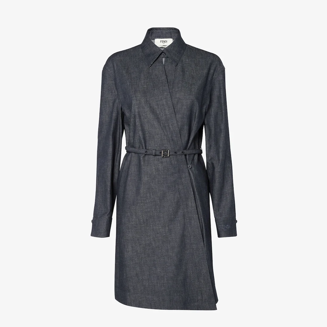 Short straight-cut shirt dress. Collar and shirt cuffs. Asymmetrical cross-over fastening with small button on the side that creates a teardrop detail on the neckline. Made of ultra-light denim chambray. Customized with a matching embroidered logo at the hem of the left sleeve. Made in Italy Composition: 100% cotton Size worn: 38 IT. The model is 178 cm tall Product Code: FLD565AVF2F0EX7