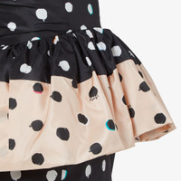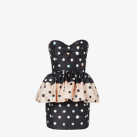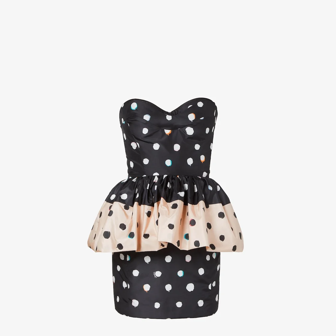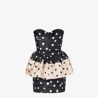 Short bustier dress with sweetheart neckline and peplum at the waist. Back zipper closure. Inspired by a dress worn by Silvia Venturini Fendi in the 1980s and made of black and pink taffeta with the Falena Dots motif printed all-over in contrasting colors. Made in Italy Composition: 100% silk, 69% polyamide, 31% elastane, lining: 100% silk Product Code: FDD509AVJQF0GME